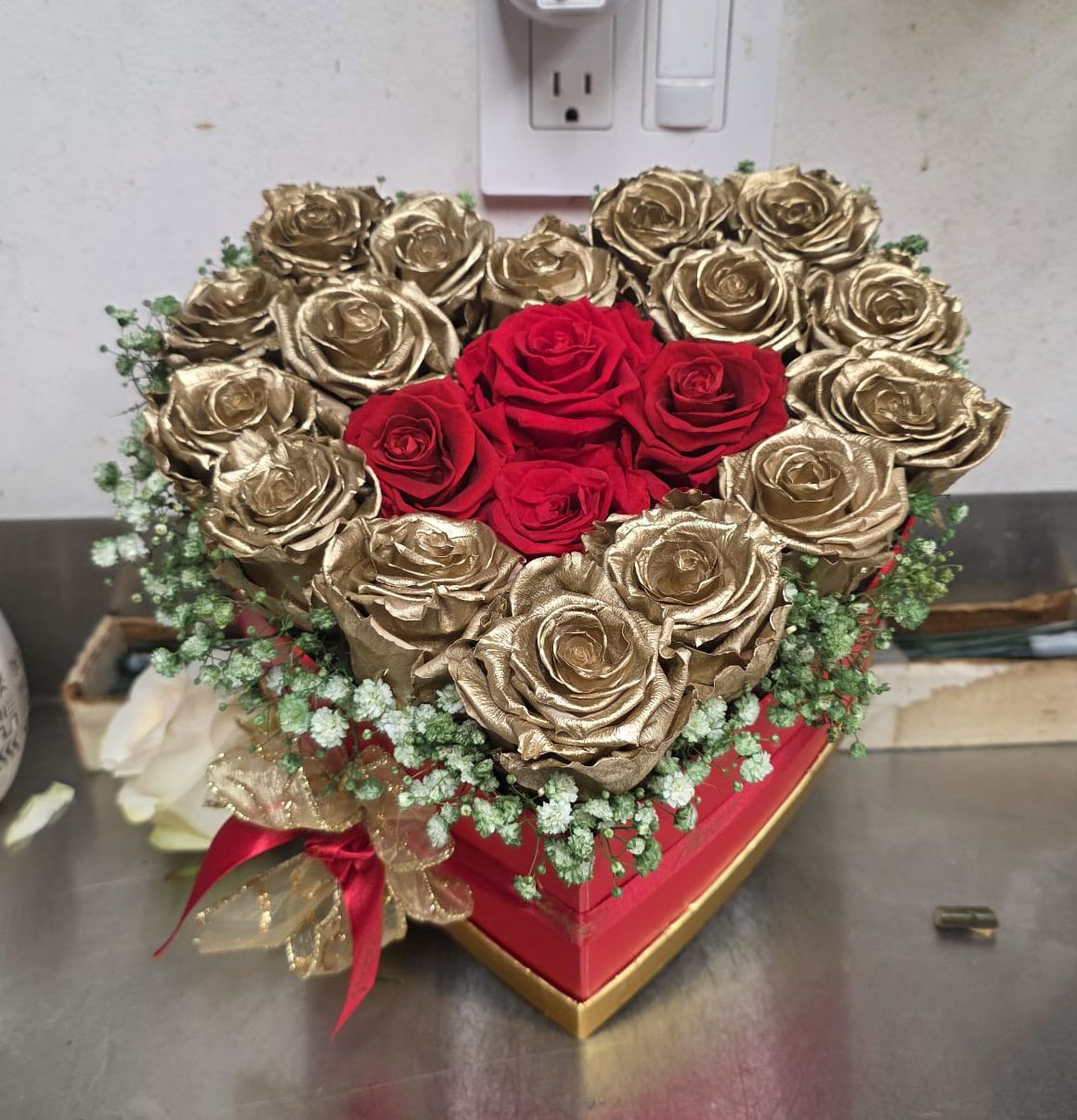 Este impresionante arreglo en forma de corazón combina la intensidad de rosas rojas premium en el centro, símbolo de amor profundo y pasión, con un elegante borde de rosas doradas, que aportan un toque de lujo, sofisticación y exclusividad.